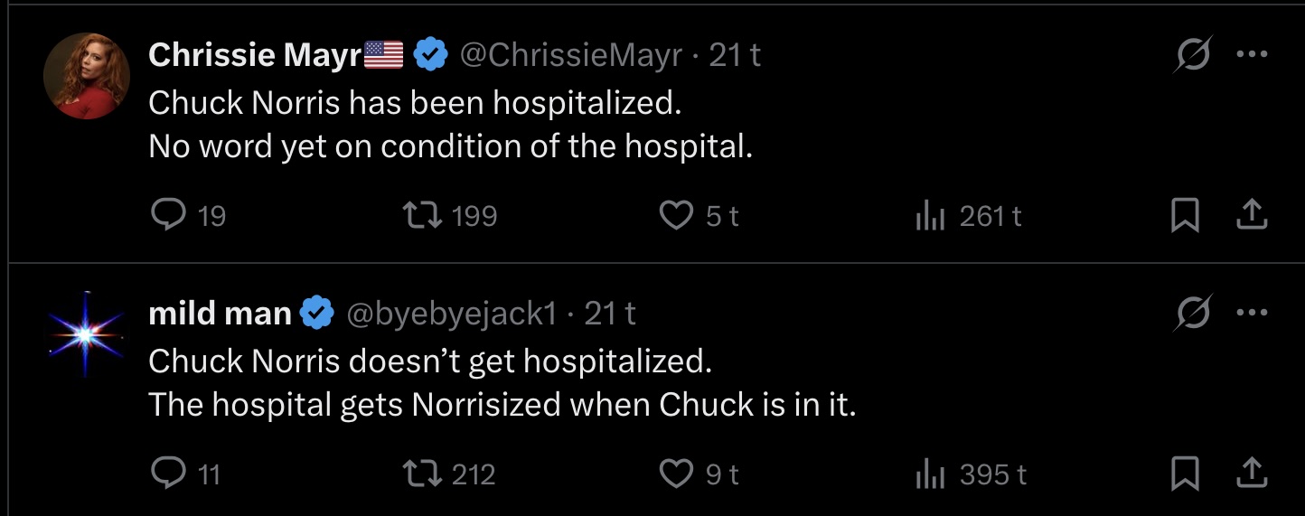 millennium | Skrevet 20/03 17:24 | | Chuck Norris knows exactly what Meat Loaf won’t do for love. | The medium is the message.